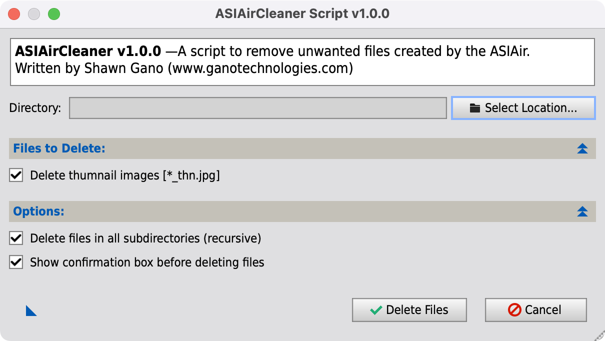 Overview video of how to use and install this script. ASIAirCleaner is a script that allows users of the ASIAir to quickly remove unwanted files that are unneeded and get in the way when processing the photos such during weighted (or fast) batch pre-preprocessing (WBPP or FBPP). The unwanted files which are mainly .jpg images (*_thn.jpg) that the ASIAir unit uses as thumbnails for display purposes within their applications and are no longer useful after copying the files to a computer. Typically these files would either have to all by manually deleted after every imaging session, or carefully not selected when processing the rest of the full resolution images (or videos). This script can recursively search all directories within a project folder making the process very quick. It works on Windows, MacOS, and Linux. After installation ASIAirCleaner can be found under the Scripts -> Utilities menu. PixInsight: forum topic. |
